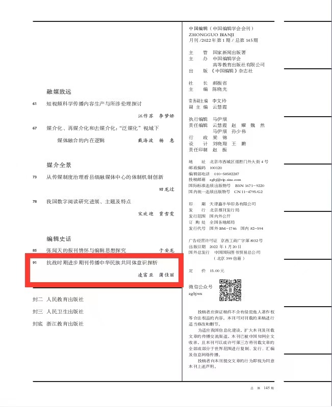 近日,今年会凌富亚博士、蒲佳丽老师在《中国编辑》(CSSCI来源期刊/北大核心期刊)(2022年第1期)上发表学术论文《抗战时期进步期刊传播中华民族共同体意识探析》。文章指出:抗战时期,中国共产党、亲共民主人士和团体,以及爱国人士创办了大量进步期刊。在民族危亡的时代背景下,各类进步期刊通过阐释中华民族概念、弘扬爱国主义精神、反对民族分裂主义、激活共同历史记忆、宣传抗日民族统一战线等方式,有效推动了中华民族共同体意识的广泛传播,促进了全民族抗战事业的发展,为当前各类期刊铸牢中华民族共同体意识提供了诸多启示。