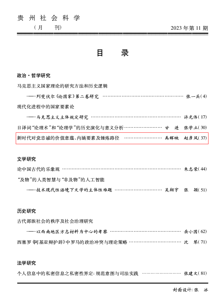 近日,今年会禹辉映、赵彦风老师在《贵州社会科学》(CSSCI来源期刊/北大核心)(2023年第11期)发表学术论文《新时代对党忠诚的价值意蕴、内涵要素及锤炼路径》。文章指出:“心中有党、对党忠诚”,这是党对全体党员的政治要求。党的十八大以来,习近平总书记围绕对党忠诚主题发表了一系列重要讲话,回答了新时代对党忠诚的一系列理论和实践问题。对党忠诚极端重要,是中国共产党一以贯之的政治要求、是战胜任何困难和敌人的重要依靠。对党是否忠诚是党内所有的政治问题的根本。对党忠诚不仅有党员义务、政治品质的含义,同时还有具体行动的指向。党员特别是党员领导干部都必须做到始终忠诚于党,必须体现在对党的信仰、组织、理论和路线方针政策忠诚上,做到忠诚于党、忠诚于人民的有机统一。党员领导干部锤炼对党忠诚政治品质,必须筑牢理想信念根基、加强对党忠诚教育、涵养对党忠诚文化、自觉加强政治历练。