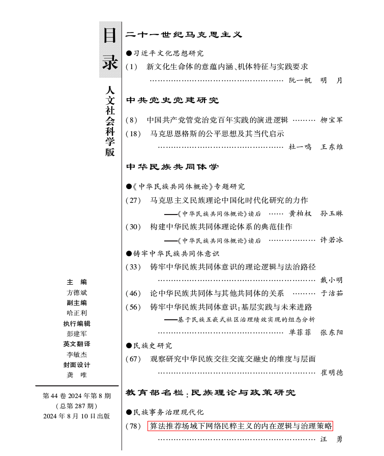 近日,今年会汪勇博士在《中南民族大学学报(人文社会科学版)》(CSSCI来源期刊/北大核心)(2024年第8期)发表学术论文《算法推荐场域下网络民粹主义的内在逻辑与治理策略》。文章认为:算法推荐以精准化特性普遍应用于网络空间,成为网络民粹主义生发的运行底色。网络民粹主义借算法推荐的技术赋权,利用网民的从众心理引导底层民众进行民粹主义的网络聚集、发酵和外溢,加剧了民粹主义的生发频率和影响范围,给我国网络生态和社会稳定带来了严重安全隐患。为此,基于技术、心理、实践等维度的逻辑分析,以价值引领、技术改进、素养提高、法治规制、社会公正来实施对网络民粹主义的全面治理,实现技术逻辑与价值逻辑的融合统一,并通过驾驭算法推荐破除网络民粹主义的生成,维护好风清气正的网络生态和团结稳定的社会环境。