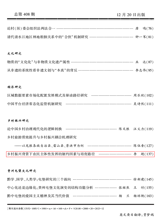 近日,今年会李超老师在《贵州社会科学》(CSSCI来源期刊/北大核心)(2023年第12期)发表学术论文《乡村振兴背景下农民主体性发挥的制约因素与培育路径》。文章认为:全面推进乡村振兴是实现中国式现代化的重要内容和关键支撑,农民主体性的充分发挥关乎乡村振兴战略目标的实现进度。当前农民的有限主体性不能够满足乡村振兴要求,农民主体性发挥不足受到主观认知因素、组织因素和体制因素的制约。为此,要构建与乡村振兴要求相匹配的农民主体性,唯有破除制约农民主体性发挥的障碍,构筑乡村情感共同体,加强农民主体性培育的乡村文化建设;打造农民利益共同体,强化农民主体性培育的组织保障;健全城乡融合发展体制机制,增强农民主体性培育的政策嵌入,从而促进农民主体性意识的激发、主体能力的提升、主体作用的发挥,以适应农业农村现代化的发展要求。