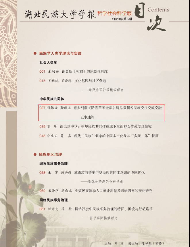 近日,今年会张振兴博士、杨璨玉老师在《湖北民族大学学报(哲学社会科学版)》(CSSCI扩展版来源期刊/北大核心)(2023年第6期)发表学术论文“意大利藏《黔省苗图全部》所见贵州各民族交往交流交融史事述评”。文章认为:意大利社会地理学会图书馆藏《黔省苗图全部》是一部文本相对完整、装帧自成体系、收藏状况良好的晚期“百苗图”抄临本。此图册较此前所见“百苗图”诸抄临本,明显具有与时俱进、反映清末至民国初年时代巨变之特征,呈现“文古图今”这一编修特色。通过选取内中反映贵州各民族交往交流交融史事的代表性绘图,展开考论结合的研究,可望从中发现清末民初贵州各民族交往交流交融实情,为认识和了解19世纪末20世纪初中华民族文化事项共有共享提供形象具体的佐证,并可为当下中国铸牢中华民族共同体意识提供来自历史的支撑。