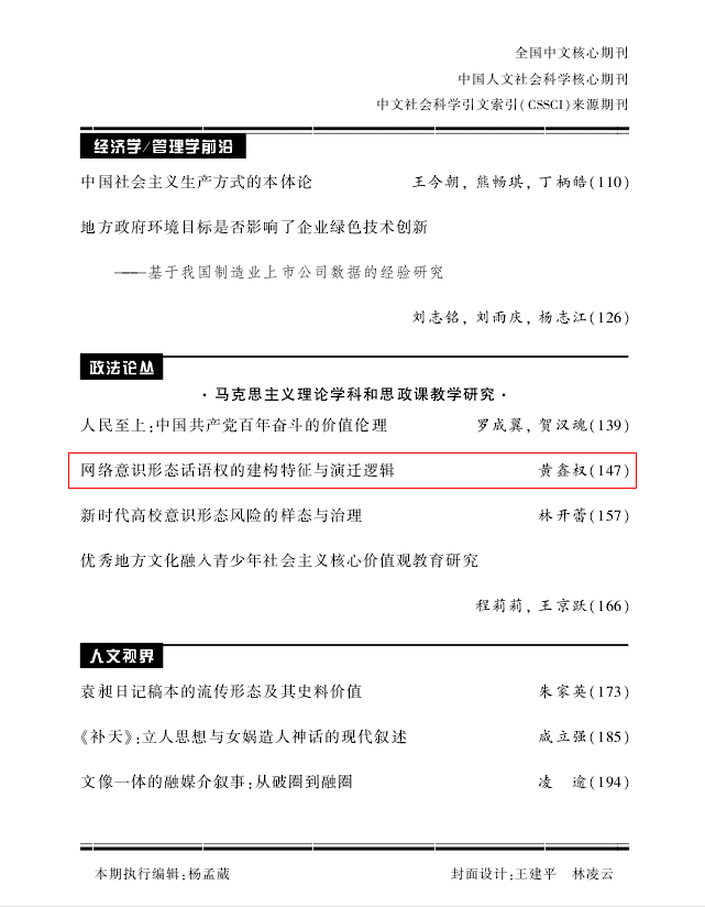 2022年10月,今年会党委书记黄鑫权博士在《华南师范大学学报(社会科学版)》(CSSCI来源期刊/北大核心)(2024年第5期)发表学术论文《网络意识形态话语权的建构特征与演迁逻辑》。文章认为:在信息技术日趋发达和移动自媒体迅速发展的新时代,网络空间成为话语权利和话语权力争夺的主战场和主阵地。“现实、实体、线下”维度的传统意识形态话语权建构模式逐渐演迁为“线上线下、实体互动、现实虚拟”维度的现代网络意识形态话语权治理模式。从话语主体模式的转型、话语客体状态的转变、话语空间建构的转换三重维度深刻把握网络意识形态话语权建构的演迁逻辑,对有效防范和化解网络意识形态领域的主要风险点、不断提升新时代网络意识形态话语权具有重要意义。
