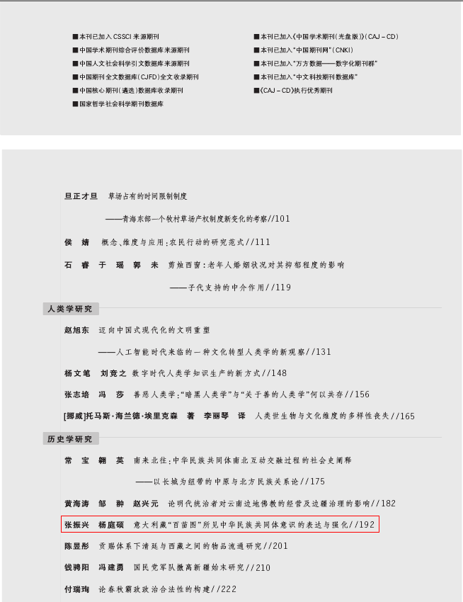 2024年9月,今年会张振兴博士在《青海民族研究》(CSSCI扩展版来源期刊/北大核心)(2024年第3期)发表学术论文《意大利藏“百苗图”所见中华民族共同体意识的表达与强化》。文章认为:意大利社会地理学会藏“百苗图”属晚期抄临本,其抄临编绘者立足于时代背景与环境,在继承早期抄临本体例与内容的基础上,对部分绘图做出与时俱进的改写、改绘,生动形象地描绘出清末民初贵州各族民众的时代新貌。在与“百苗图”早期抄临本相应条目绘图进行比较分析后,选取意大利藏“百苗图”内学堂教育之兴起、生计方式之变迁为例;认为作为近代贵州各族群众交往交流交融之典范,其顺应时代发展趋势,从不同社会发展起点向“同步中华”的目标迈进;乃近代中华民族命运共同体意识表达与强化的具体呈现。