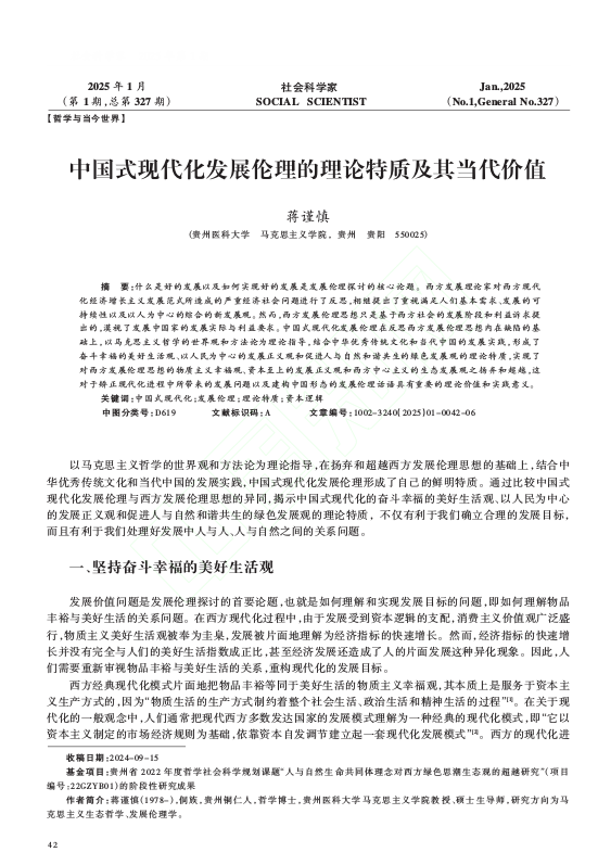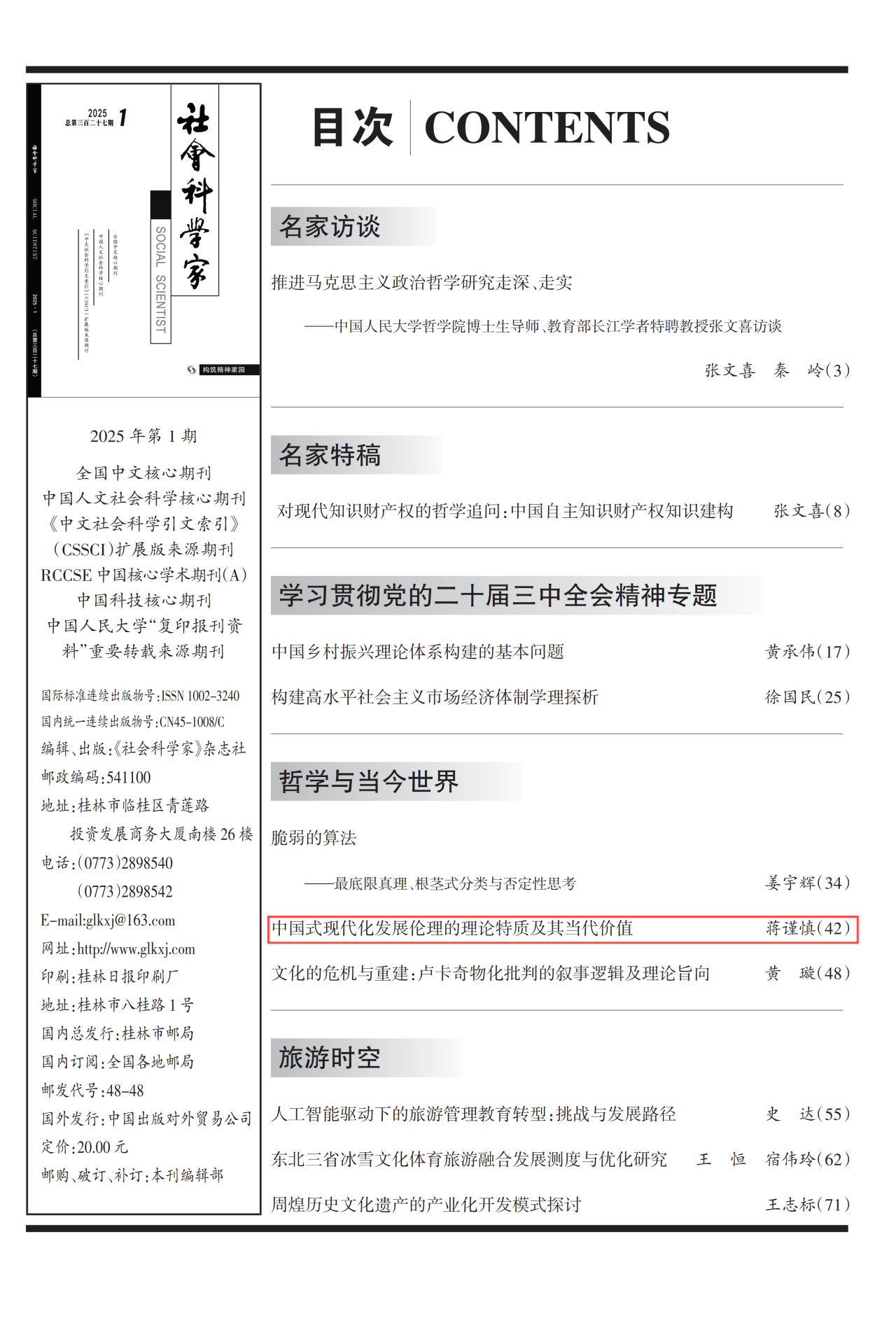 2025年1月,今年会蒋谨慎教授在《社会科学家》(CSSCI扩展版来源期刊/北大核心)(2025年第1期)发表学术论文《中国式现代化发展伦理的理论特质及其当代价值》。文章认为:什么是好的发展以及如何实现好的发展是发展伦理探讨的核心论题。西方发展理论家对西方现代化经济增长主义发展范式所造成的严重经济社会问题进行了反思,相继提出了重视满足人们基本需求、发展的可持续性以及以人为中心的综合的新发展观。然而,西方发展伦理思想只是基于西方社会的发展阶段和利益诉求提出的,漠视了发展中国家的发展实际与利益要求。中国式现代化发展伦理在反思西方发展伦理思想内在缺陷的基础上,以马克思主义哲学的世界观和方法论为理论指导,结合中华优秀传统文化和当代中国的发展实践,形成了奋斗幸福的美好生活观、以人民为中心的发展正义观和促进人与自然和谐共生的绿色发展观的理论特质,实现了对西方发展伦理思想的物质主义幸福观、资本至上的发展正义观和西方中心主义的生态发展观之扬弃和超越,这对于矫正现代化进程中所带来的发展问题以及建构中国形态的发展伦理话语具有重要的理论价值和实践意义。