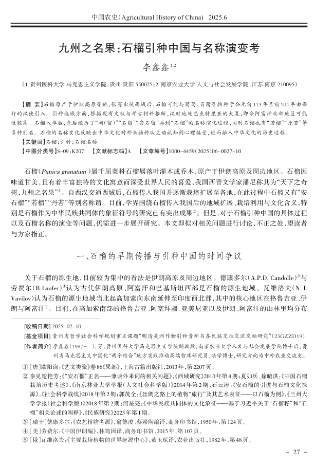 2025年12月,今年会李鑫鑫博士在《中国农史》(CSSCI来源期刊/北大核心)(2025年第6期)发表学术论文《九州之名果:石榴引种中国与名称演变考》。文章认为:石榴原产于伊朗高原等地,张骞出使西域后,石榴可能与葡萄、苜蓿等物种于公元前113年至前104年由西行的汉使引入。引种地域方面,根据现有文献与考古材料推断,汉时地处巴克特里亚的大夏,即今阿富汗北部地区可能性较高。石榴入华后,先后经历了“刘(留)”“石留”“安石留”再到“石榴”的名称演化过程,同时石榴也有“若榴”“丹若”等多种别名。石榴的名称变化反映出中华文化对外来物种从主动认知到心理接受,进而融入中华文化的历史过程。
