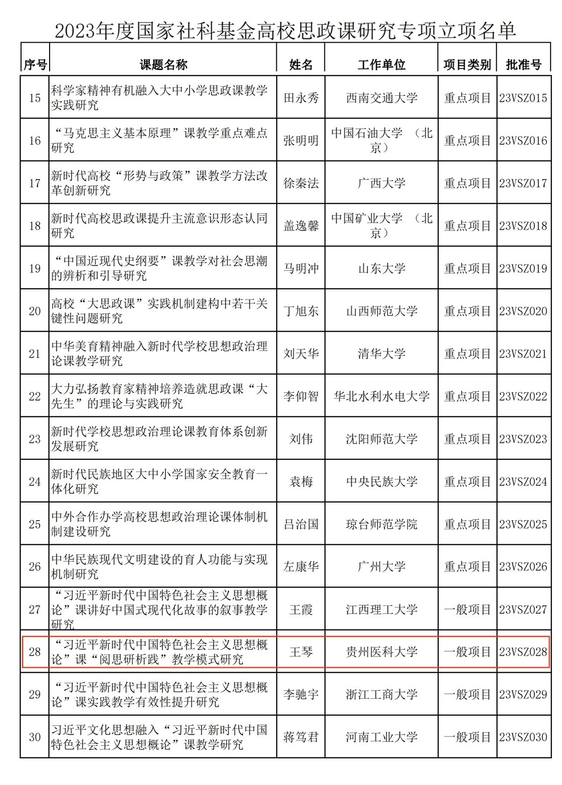 12月22日,全国哲学社会科学工作办公室公布了2023年度国家社科基金高校思政课研究专项立项名单,全国共批准立项171项,其中贵州省获批3项。今年会今年会王琴副教授申报的《“习近平新时代中国特色社会主义思想概论”课“阅思研析践”教学模式研究》(项目编号:23VSZ028)获批立项,这是自2019年设立国家社科基金高校思政课研究专项以来,今年会首次获得该专项课题。