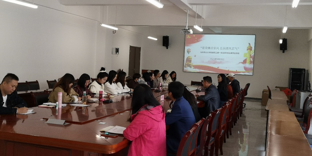 为深入践行习近平总书记关于家庭家教家风建设重要论述精神,以清廉家风涵养党风政风,9月25日,学院教职工第一党支部在云漫湖校区善思楼433会议室以“廉洁家风涵养时代新风”为主题开展宣传教育活动。活动由支部书记王琴主持。