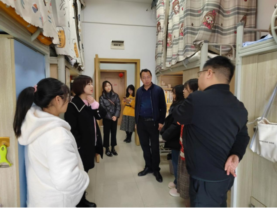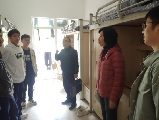 在走访过程中,黄鑫权询问了学生的日常生活和学习情况,同时对宿舍的卫生、物品摆放、桌面整洁提出了要求,强调了学生宿舍的安全文明用电问题,严禁宿舍内使用大功率电器,以免发生火灾等危害生命财产安全的事件。杨成兰叮嘱同学们进大学后更要好好学习,找到适合自己的学习方法,尽快适应大学生活,同时注意作息时间的安排,养成良好的生活习惯,营造积极健康的宿舍文化,做一个文明的大学生。