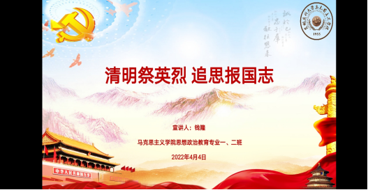 钱隆首先介绍清明节的意义,他宣讲到清明节是传统的重大春祭节日,扫墓祭祀、缅怀祖先,是中华民族自古以来的优良传统,不仅有利于弘扬孝道亲情、唤醒家族共同记忆,还可促进家族成员乃至民族的凝聚力和认同感。接着,钱隆讲述了董存瑞舍身炸暗堡、烈火中的英雄邱少云、梁士英身顶爆破筒等爱国主义英雄事迹,和同学们一起追忆这群为了祖国的解放事业,抛头颅,洒热血,献出自己的青春年华和宝贵生命的英烈。随后,钱隆播放了《客观分析:袁隆平对中国的贡献有多大?》《中美战机逼近,王伟烈士的最后影像》两个视频,以此缅怀袁隆平先生和王伟烈士。