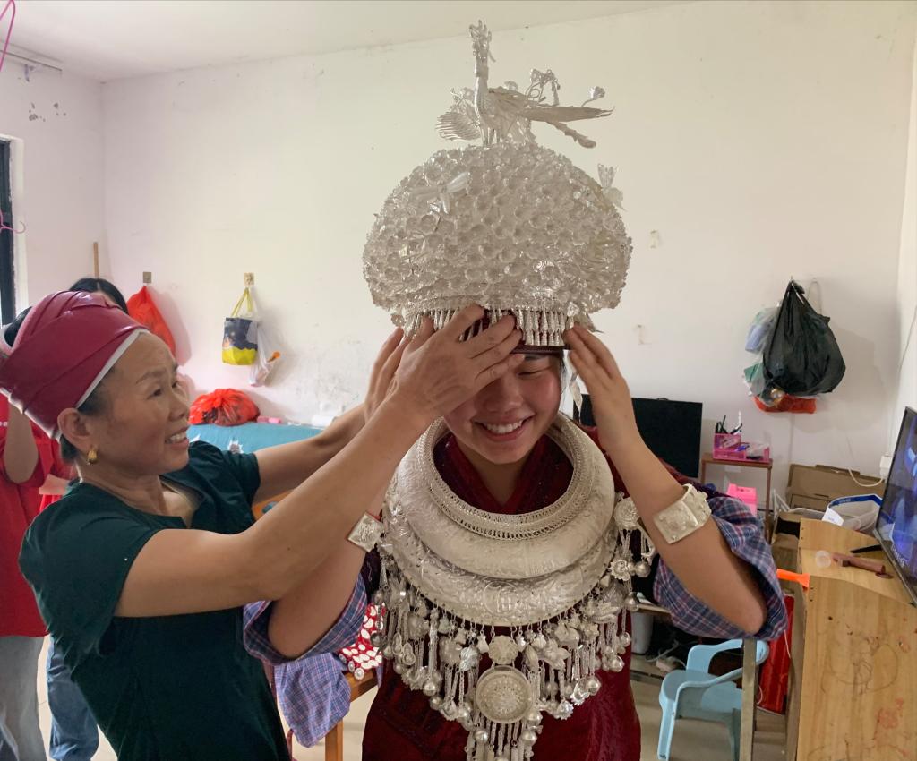 7月16日,实践队全体成员首先来到当地苗绣传承人潘阿姨家中。潘阿姨从事苗绣已有四十余年,她向志愿者们详细介绍了苗绣在苗族婚嫁、节庆等传统习俗中的重要地位。她还提到,黄平苗绣图案多取材于几何图形,黄平苗绣绣法常采用数纱绣、锁绣。实践队成员边听边记,用镜头定格下那些带着温度的绣品与故事。此外,潘阿姨还展示了她珍藏的苗衣,并热情地邀请实践队成员试穿苗衣。大家在试穿过程中, 近距离感受苗衣的刺绣工艺、服饰结构,体会苗族服饰中“以针为笔、以线为墨”的文化表达。