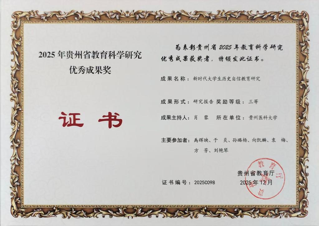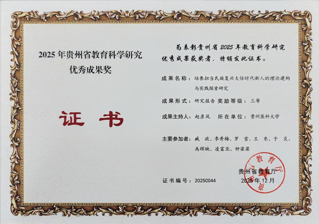 近日,贵州省教育厅公布了2025年教育科学研究优秀成果奖评选结果,今年会喜获3项奖项,展现了在教育科学研究领域的扎实实力。此次获奖成果涵盖终身教育、时代新人培养、大学生历史自信教育等方向。其中,王琴申报的《逻辑・价值・实践:终身教育赋能教育强国研究》(论文)荣获二等奖;赵彦风申报的《培养担当民族复兴大任时代新人的理论建构与实践探索研究》(研究报告)、肖蓉申报的《新时代大学生历史自信教育研究》(研究报告)均获三等奖。