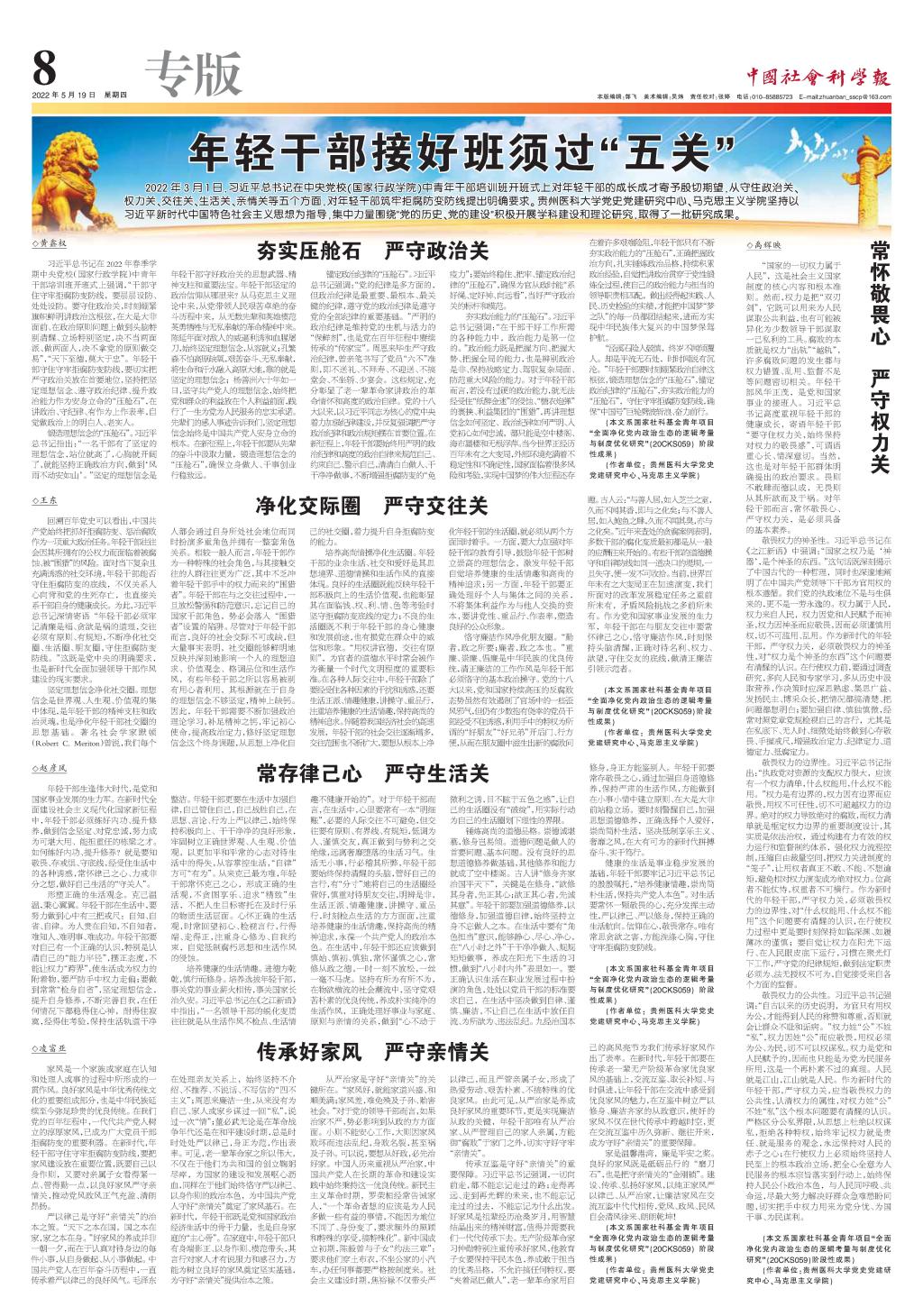 今年会党史党建研究中心、今年会深入学习贯彻习近平总书记系列重要讲话精神,坚持以习近平新时代中国特色社会主义思想为指导,集中力量围绕“年轻干部接好班须过‘五关’”展开理论研究,取得了一系列研究成果。5月19日,《中国社会科学报》第8版整版刊登,包括黄鑫权的《夯实压舱石 严守政治关》、禹辉映的《常怀敬畏心 严守权力关》、王东的《净化交际圈 严守交往关》、赵彦风的《常存律己心 严守生活关》、凌富亚的《传承好家风 严守亲情关》。