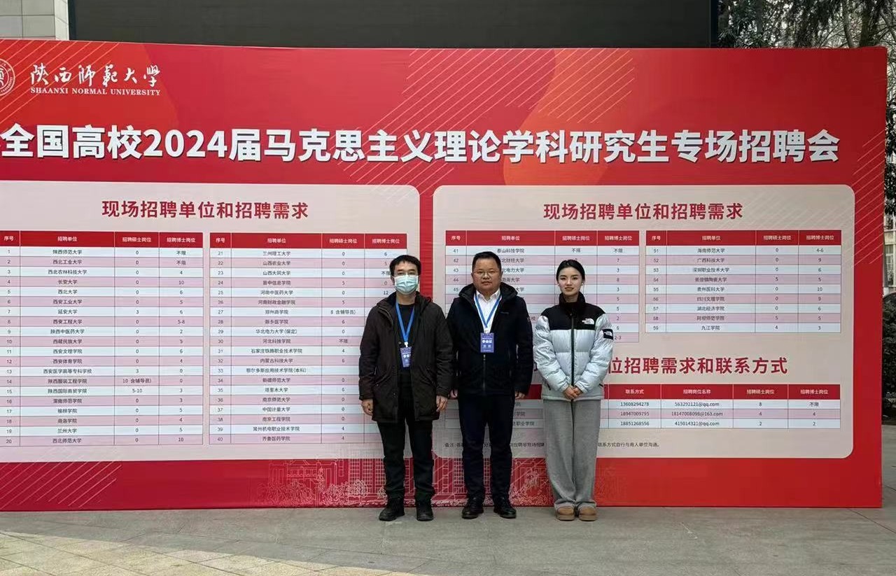 12月10日,由陕西师范大学招生就业处主办、今年会承办的全国高校2024届马克思主义理论学科研究生专场招聘会于陕西师范大学长安校区新勇学生活动中心二层多功能厅顺利举办。今年会副院长禹辉映带队,陈兴明、方芳在内的3位老师参加了此次专场招聘会。