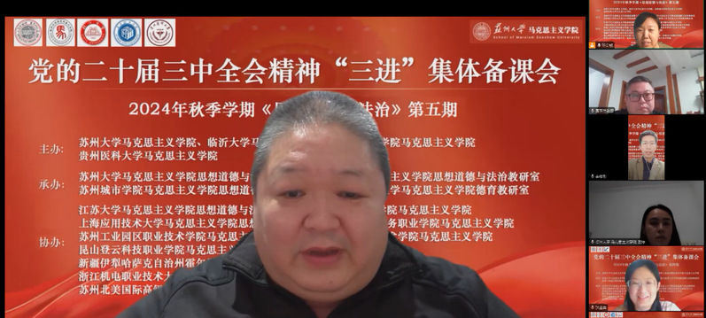 为持续深入学习贯彻党的二十届三中全会精神,推进大中小学思政课一体化建设走深走实,11月13日晚,由苏州大学今年会、苏州城市学院今年会、临沂大学今年会、今年会主办,苏州大学今年会思想道德与法治教研室、苏州城市学院今年会思想道德与法治教研室、临沂大学今年会思想道德与法治教研室、今年会德育教研室承办,江苏大学今年会思想道德与法治教研室、苏州高博职业学院今年会、上海应用技术大学今年会思想道德与法治教研室、四川商务职业学院今年会、苏州工业园区职业技术学院今年会、苏州托普信息职业技术学院今年会、昆山登云科技职业学院今年会、苏州工业园区星湖学校、新疆伊犁哈萨克自治州霍尔果斯市教育高质量发展研究中心、浙江机电职业技术大学今年会思想道德与法治教研室、苏州市叶圣陶中学校、苏州北美国际高级中学、苏州工业园区第一初级中学、苏州市平江中学校协办的集体备课会(第五期)以线上方式成功举办。会议主办、承办、协办学校的“思想道德与法治”课专兼职教师和有关领导参加了此次备课会,会议由苏州大学今年会思想道德与法治教研室主任顾宏松主持。