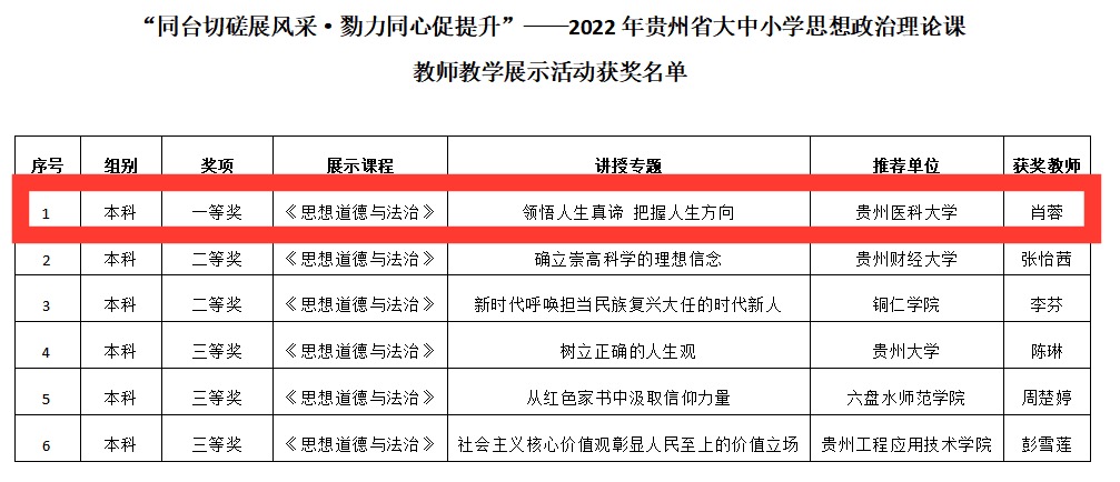 近日,省教育厅公布了“同台切磋展风采·勠力同心促提升”——2022年贵州省大中小学思想政治理论课教师教学展示活动获奖名单。今年会教师肖蓉获教学展示活动《思想道德与法治》课程一等奖。