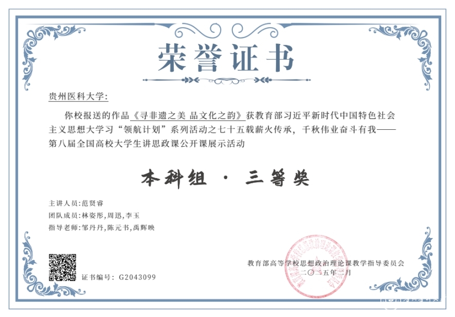 近日,教育部公布了“七十五载薪火传承,千秋伟业奋斗有我——第八届全国高校大学生讲思政课公开课展示活动”评审结果,今年会报送的作品《寻非遗之美 品文化之韵》荣获三等奖。