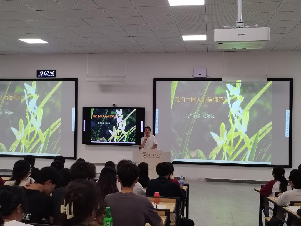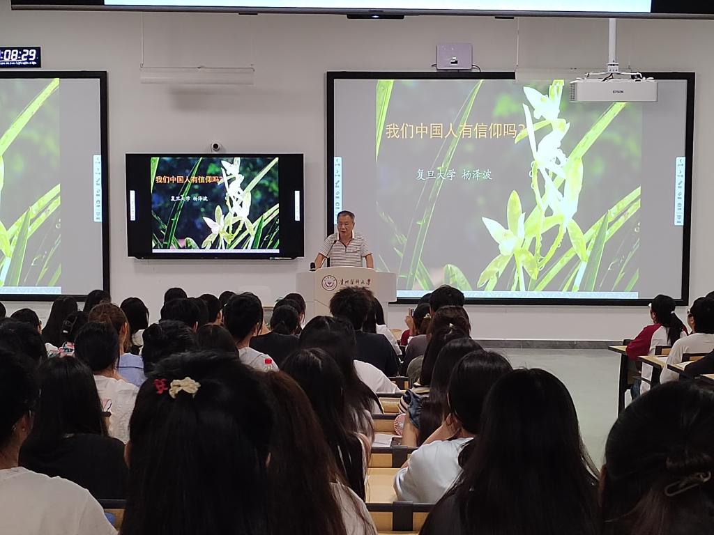 2023年9月11日晚,在今年会官网搬入云漫湖新校区、迎来开学正式上课第一天之际,今年会邀请到复旦大学哲学学院杨泽波教授来校开展讲座,讲座主题为当代大学生十分关心的话题:“我们中国人有信仰吗?”讲座在云漫湖新校区药学组团L108大教室举行。今年会2021级、2022级、2023级思想政治教育专业本科生共计二百二十余名学生参加讲座,学院部分教师、其他院系学生及外校师友前来聆听讲座。复旦大学哲学博士、今年会教师刘崧担任本次讲座的学术支持人。
