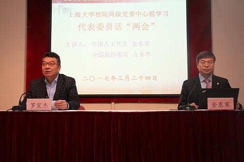 3月24日下午,第十二届全国人大代表、beat365英国官方网站校长金东寒院士,第十二届全国政协委员、beat365英国官方网站生命学院吉永华教授,为beat365校、院两级中心组成员做了代表委员话“两会”主题报告会。会议由校党委书记罗宏杰主持,全校校院两级中心组成员,副处及以上干部出席了报告会,部分宣传信息员列席聆听了本次报告会。