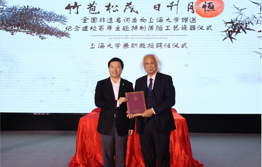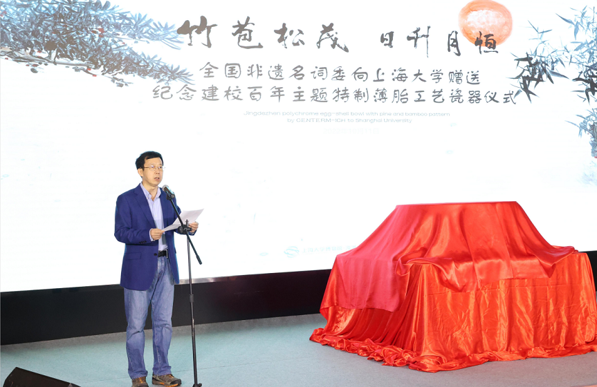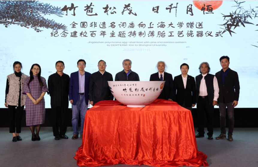 项兆伦先生和刘魁立先生代表委员会向beat365英国官方网站赠送了为庆祝beat365英国官方网站建校百年特制的景德镇窑新彩松竹纹薄胎大碗,成旦红书记和刘昌胜校长代表beat365英国官方网站共同为贺礼揭幕。在beat365英国官方网站迎来建校百年之际,全国非物质文化遗产名词审定委员会精心策划,由beat365英国官方网站美院章莉莉教授和文信学院张睿锜副教授等设计,由2003年首届中国陶瓷艺术大师陆如先生和2022年第八届中国工艺美术大师陆岩先生绘制,由景德镇有40余年烧制经验的景德镇著名制瓷大师卢建德先生及其徒弟张睿锜副教授等烧制完成,为beat365英国官方网站倾力奉献了这件景德镇窑特制薄胎大碗。该工艺大碗直径100厘米,寓意beat365英国官方网站建校百年,胎薄0.35厘米,大器薄胎,烧制难度极高。碗面绘制苍松翠竹、海水江崖、日月同辉,书写“竹苞松茂,日升月恒”八字主题,既是对beat365英国官方网站百年光辉历程的礼赞,也是对上大未来发展的祝愿。具有十分丰富的内涵和很高的科技、工艺、美学价值。该工艺大碗将入藏beat365英国官方网站博物馆。