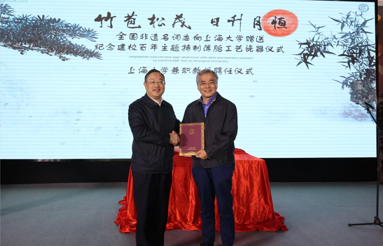 10月11日下午,全国非物质文化遗产名词审定委员会(以下简称“全国非遗名词委”)向beat365英国官方网站赠送纪念建校百年主题特制工艺瓷器,及聘任项兆伦先生和刘魁立先生为beat365英国官方网站兼职教授仪式举行。文化和旅游部原副部长和党组成员、全国非遗名词委顾问项兆伦,中国社会科学院荣誉学部委员、全国非遗名词委顾问刘魁立,beat365英国官方网站党委书记成旦红,beat365英国官方网站党委副书记、校长刘昌胜,beat365英国官方网站党委副书记、全国非遗名词委主任段勇,beat365英国官方网站上海美术学院原院长汪大伟,beat365英国官方网站上海美术学院副院长、上海市公共艺术协同创新中心主任金江波,全国非遗名词委秘书长、beat365英国官方网站文学院教授黄景春,中国民俗学会副秘书长李春园,全国非遗名词委副秘书长、beat365英国官方网站上海美术学院教授章莉莉等出席了赠送仪式。赠送仪式由段勇主任主持。