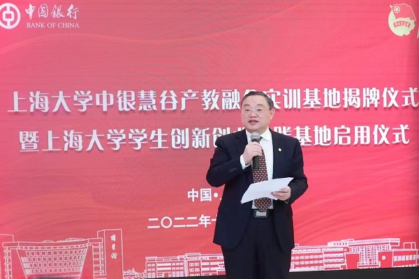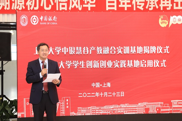 beat365英国官方网站党委书记成旦红在致辞中表示,长期以来,beat365英国官方网站积极响应国家号召,高度重视创新创业人才培养工作并与社会各界展开多方合作,取得了良好的育人成果,并于近期获评国家级创新创业教育实践基地。本次“中银慧谷”产教融合实训基地的揭牌和学生创新创业实践基地的启用是中国银行和beat365英国官方网站友好合作的展现,是坚持为党育人、为国育才的具体体现,更是贯彻落实党的二十大精神的奋进之笔。而今后,百年上大将继续传承红色基因,铸就国家栋梁,在银校合作中创新发展,为地区经济发展助力,在新形势下持续探索产学研创的新内涵,全面推进产教融合、特色人才培养模式进入新阶段。