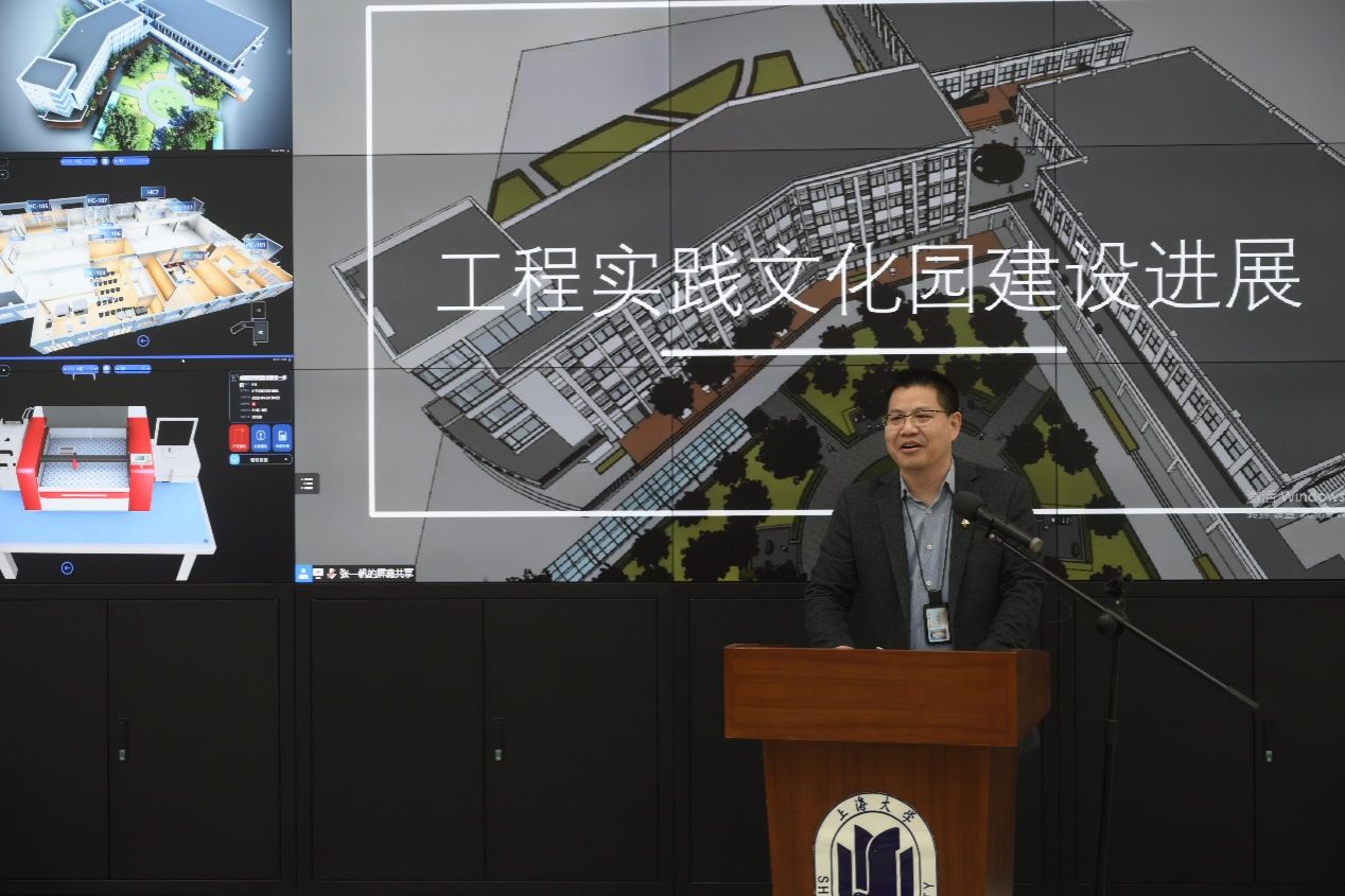 工训中心主任郭帅介绍工程文化园建设过程:上大工训人亲自动手,对老旧机床创新的通过声光电等手段进行改造,变废为宝,让报废的老机床焕发新的生命,让同学更加深入认识、了解揭秘机床内部世界,给全校师生增加一个全年24小时无休工程文化体验新空间。
