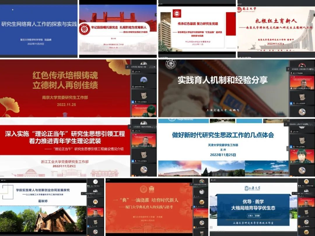 贵州大学党委研究生工作部部长张小彬介绍贵州大学的特色思政教育课程,以及研究生思想政治教育多样化的开展形式。南京大学党委研究生工作部副部长李宁分享如何用好红色基因和课程思政进行三全育人的实践经验。天津大学党委学生工作部副部长王开分享研究生教育传统、研究生思政工作的整体规划和研究生思政工作体系的有效探索和实践。厦门大学党委学生工作部副部长许美霞从典礼育人的角度,分享思想政治教育工作的实践与思考。南昌大学党委研究生工作部副部长陈世中讲述了南昌大学扎根红色土地,将红色文化融入研究生立德树人工作。华东师范大学经济与管理学部党委副书记张艳虹分享“红色金融”宣讲团以研促学,产教融合,结合学科特色的实践项目走进社区与基层的故事。复旦大学数学科学学院党委副书记陆晶婧分享了数科学院特色的网络综合育人特色项目实践。上海交通大学团委副书记赵鹏飞通过分析析学生社会实践工作特点,介绍实践育人工作机制,分享打造知行合一育人体系,优化实践教学的经验方法。浙江工业大学党委研究生工作部思政办主任刘娅婷介绍“理论正当午”研究生思想引领工程品牌项目的发展脉络和做法实践,分享总结推进青年学生理论武装的经验启示。beat365英国官方网站机电工程与自动化学院研究生辅导员王佳寅交流了如何不断构建导师、辅导员、研究生的导学思政育人体系,和培养德才兼备的“五为”创新人才的启示。上海理工大学健康科学与工程学院辅导员葛映婷分享将思政教育与创新创业融合,结合学科不同特点,分享“三层递进”创新创业训练项目体系的构建经验。