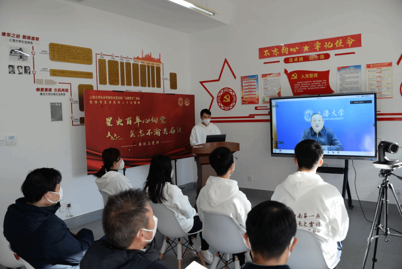 百年上大,薪火相传。今年正逢党的二十大胜利召开,为认真学习贯彻党的二十大精神,推进党史、校史学习教育,12月15日上午,社会学院秋白党支部以线上线下结合的方式开展“星火百年心向党,矢志不渝共奋进”主题党日活动,邀请校党委书记成旦红为支部学生党员宣讲党的二十大精神。本次专题党课由社会学院秋白党支部副书记魏明主持,校党委书记成旦红,校党委常委、组织人事部常务副部长、组织处处长、党校常务副校长沈艺,图书馆博物馆档案馆党委书记王远弟,档案馆馆长卢志国,社会学院党委书记杨锃,社会学院党委副书记、院长黄晓春,社会学院党委副书记、副院长张乃琴,社会学院团委书记回胜男以及秋白党支部全体学生党员出席本次活动。