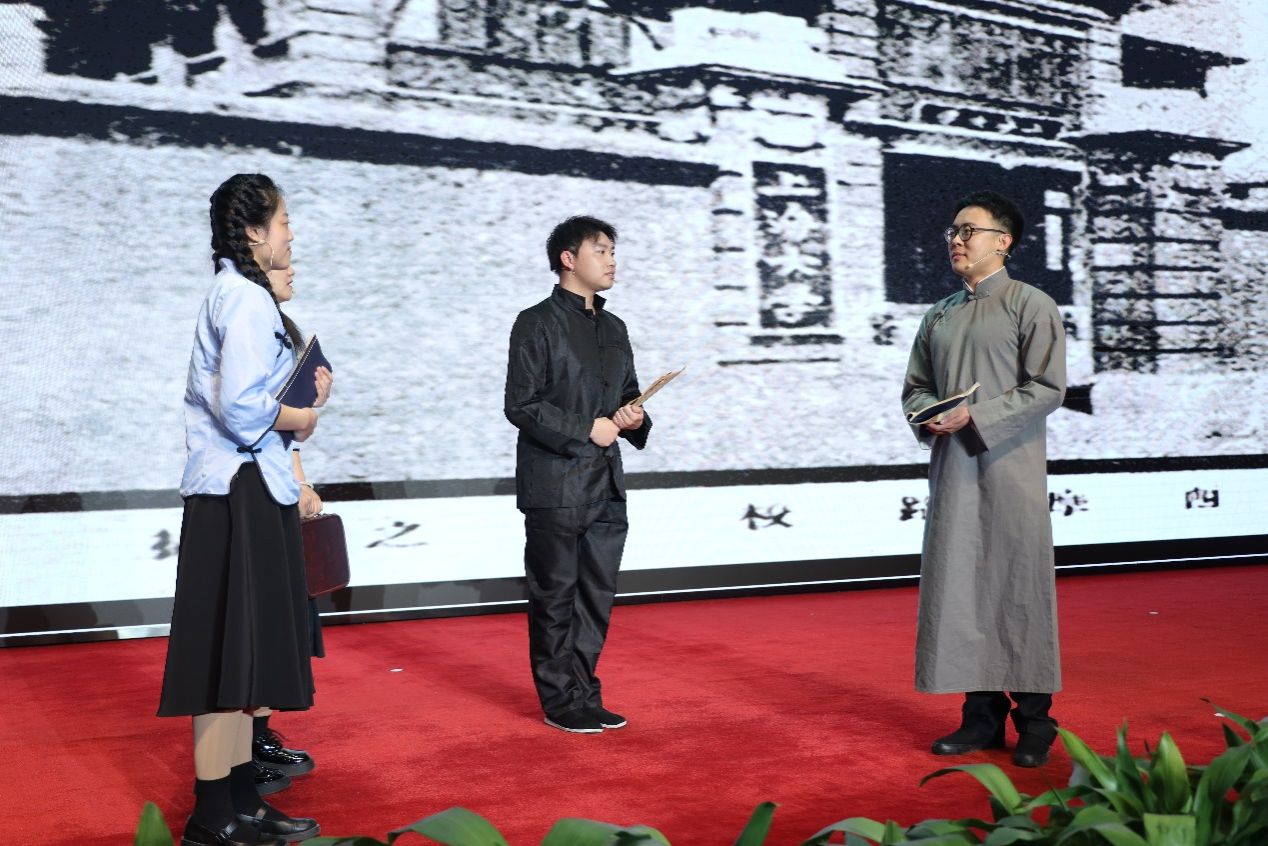 管理学院研究生党员闫建敏、文学院研究生郭捷和海燕咏歌团共同唱响《错位时空》(五四版)。社会学院秋白党支部、马克思主义学院守常党支部、法学院中夏党支部的同学们共同呈现了《上大蓝图 百年擘画》的情景党课,李大钊、瞿秋白、邓中夏等革命先辈共叙情谊、共绘蓝图、共谋发展的情景再现,将大家带回到那个激扬的革命年代。