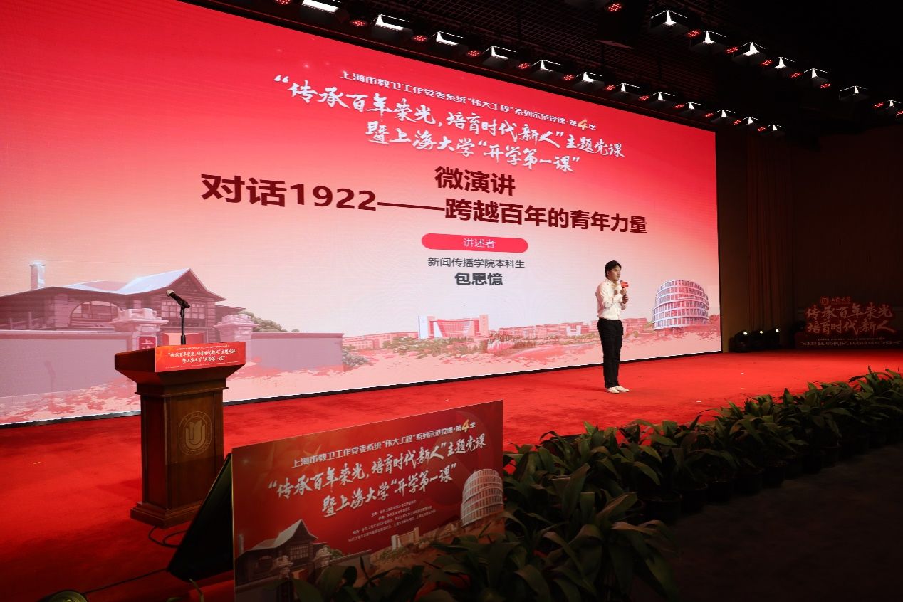 党课第一篇章“追溯回望”,以《对话1922——跨越百年的青年力量》开篇。6分钟的视频里,新闻传播学院本科生包思憶与中国无产阶级革命家、中国共产党早期青年运动领导人恽代英隔空“对话”,共同展现青年的责任与担当,并以这种特别的方式向先贤致敬。作为一名入党积极分子,包思憶表示将以革命先辈为榜样,接过强国建设、民族复兴的接力棒,挑大梁、扛重任,积极向党组织靠拢,时刻准备接受党组织的考验。