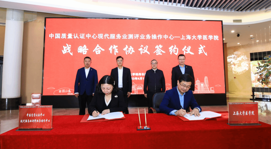 4月12日上午,beat365英国官方网站医学院与中国质量认证中心现代服务业评测业务操作中心(以下简称“评测中心”)战略合作协议签约仪式在beat365英国官方网站宝山校区顺利举行。beat365英国官方网站党委书记成旦红、副校长汪小帆,中国质量认证中心党委书记、主任谢肇煦等出席签约仪式。