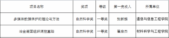 在获得一等奖的5项成果中:自然科学奖一等奖有2项,分别是通信与信息工程学院张新鹏教授主持完成的《多媒体数据保护的理论与方法》和材料科学与工程学院翟启杰教授主持完成的《冶金凝固组织调控基础》。
