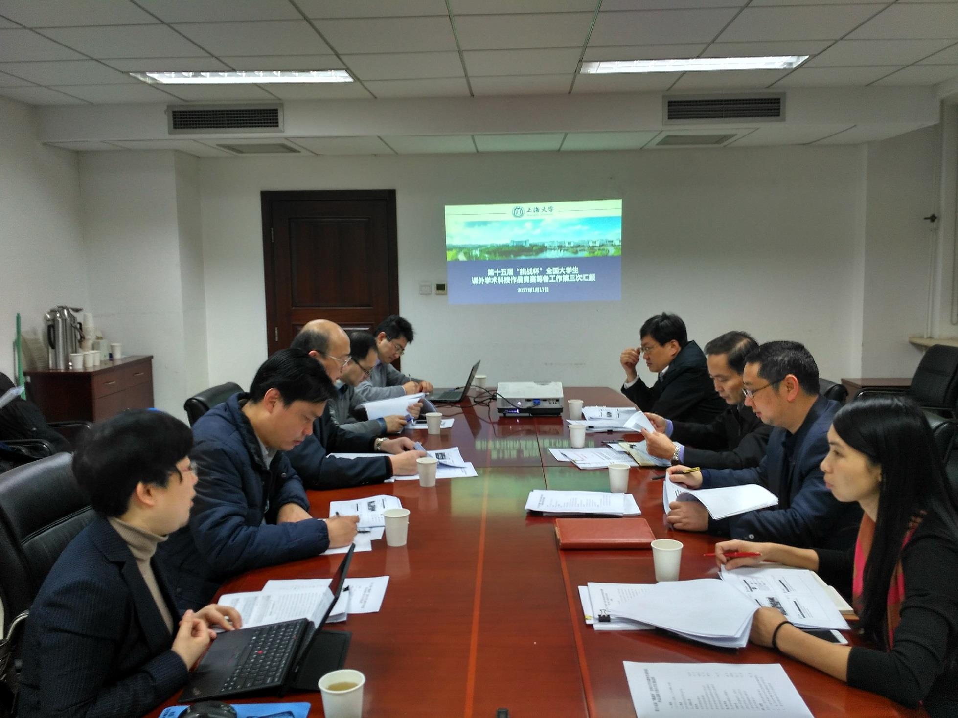 首先,许烁作了第十五届“挑战杯”竞赛筹备工作情况汇报,汇报结合傅振邦书记和杜汇良部长前期指导工作中提出的“三个结合”、“三个提升”和“三个面向”具体要求,围绕赛事机制体制、主体赛事、专项赛事、特色活动四个方面展示了筹备工作进展。