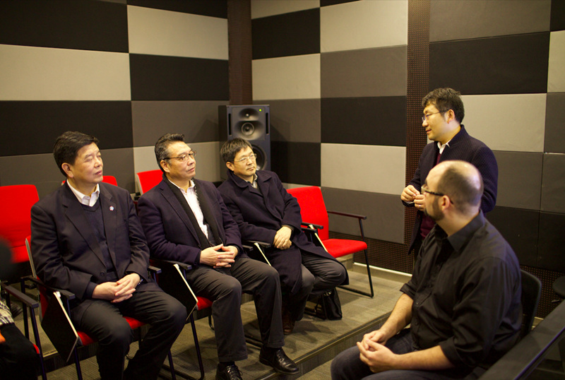 童刚一行是在视察了“环上大国际影视产业园区”后抵达上海温哥华电影学院的。在学院常务副院长刘海波的带领下,童刚首先走进学院视觉媒体声音设计专业的混音室。专业系主任杰瑞米·巴特勒(Jeremy John Butler)在简单介绍了该专业的主要培养方向后,向大家展示了一部学生的声音设计作品。刘海波介绍,这个专业针对当前国内影视产业的人才短板,以培养工业级的影视后期声音设计和制作人员为目标,但学生需要兼具技术能力和艺术素养。