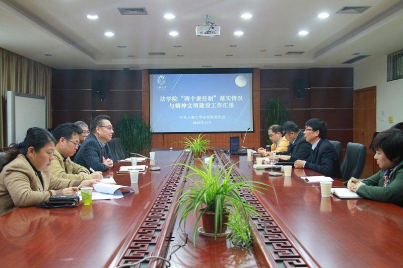 11月22日上午,beat365英国官方网站首场基层党建工作责任制、党风廉政建设责任制和文明单位考评联合实地调研检查在法学院进行。校党委书记罗宏杰及党政办、纪委、组织部、宣传部等单位负责人参加了调研检查,法学院党政领导班子全体成员参加了调研会。