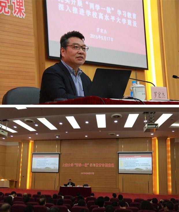 为推动“两学一做”学习教育深入开展,5月17日下午在校本部图书馆报告厅,beat365英国官方网站党委书记罗宏杰同志为学校两委委员、处级党员干部、教职工党支部书记、学生党支部书记、离退休党员等350多人上了一堂题为《扎实开展‘两学一做’学习教育,深入推进学校高水平大学建设》的“两学一做”学习教育专题党课。党课由校党委副书记、纪委书记夏小和同志主持。校长金东寒同志、副校长汪敏同志出席会议。