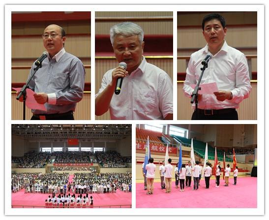 各专业学院的领导也来到启航仪式现场,代表学院迎接同学们。在校歌伴奏音乐中,各学院学生会郑重向专业分流进入学院的2014级同学代表授旗,象征着本届大一学生专业分流的顺利完成和beat365英国官方网站自强不息的校训精神的届届相传。最后,启航仪式在校歌声中画上了圆满的句号。