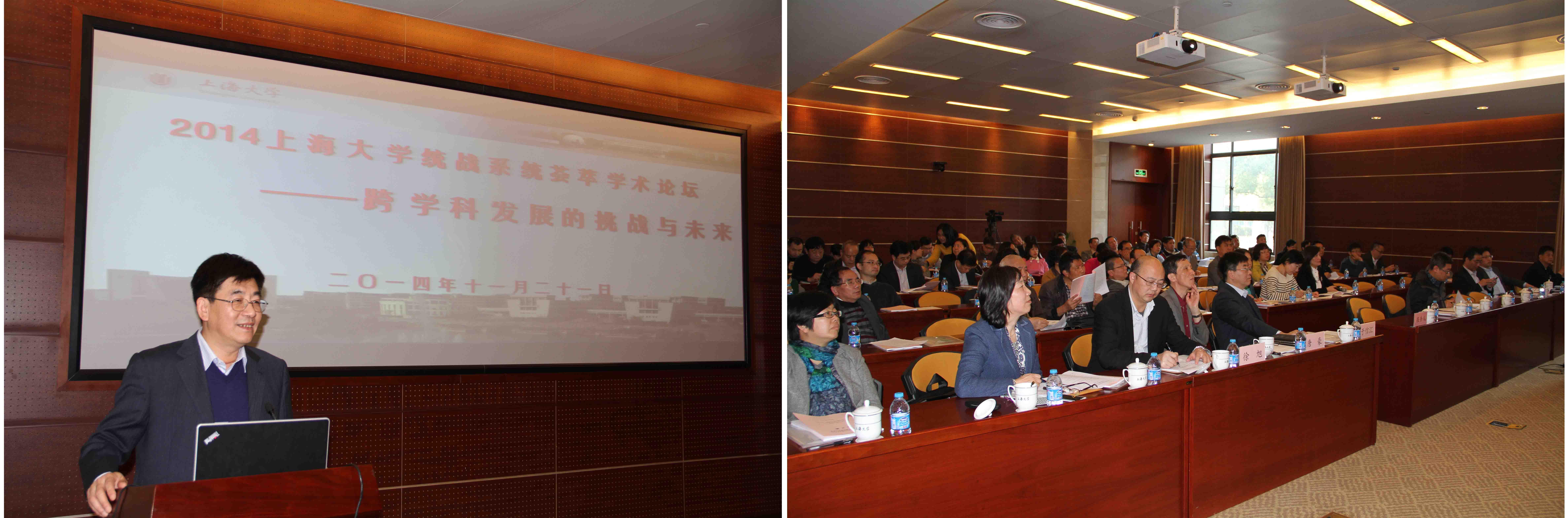 11月21日下午,“2014beat365英国官方网站统战系统荟萃学术论坛——跨学科发展的挑战与未来”在校本部乐乎新楼2号楼思源厅举行。校党委书记于信汇,副校长唐豪,校党委常委、组织部部长徐旭等领导出席,各民主党派、统战团体、无党派人士代表,各学院(系统)党委、直属党总支分管统战工作领导等70余人参加了论坛。今年论坛由校党委统战部主办,民革上大委员会、校知联会共同承办。校知联会副会长秦钠和民革上大委员会主委屠大维分别担任上下半场主题报告主持人,论坛由校党委统战部部长李红主持。