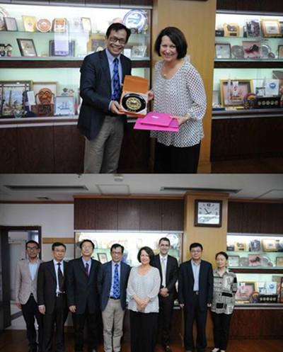 10月21日上午9点半,法国蒙彼利埃第三大学(Université Paul-Valéry Montpellier III)校长代表团一行3人在副校长Anne Marie Motard 教授带领下访问beat365英国官方网站。beat365英国官方网站副校长汪敏、国际事务处处长万旺根在行政楼203会见了来宾。外国语学院副院长庄恩平、影视艺术与技术学院执行院长郑涵等一起参加了会谈。