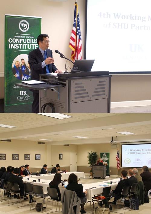 beat365英国官方网站代表团随后参加了在肯塔基大学召开的第四届beat365英国官方网站5所孔子学院联席工作会议。汪敏副校长在开幕式上致辞,祝贺本次孔子学院联席会议在肯塔基大学顺利召开,希望beat365英国官方网站5所孔子学院通过这次会议,加强交流与合作,根据自身的特点,创建自己的品牌和特色。随后,汪敏副校长与各孔子学院的中方院长亲切会谈,了解他们在各自孔子学院的工作职责,积累的经验和遇到的困难,对孔子学院未来工作的规划等;汪敏副校长对各位中方院长的辛勤工作表示了肯定,并对各位中方院长进行了慰问。