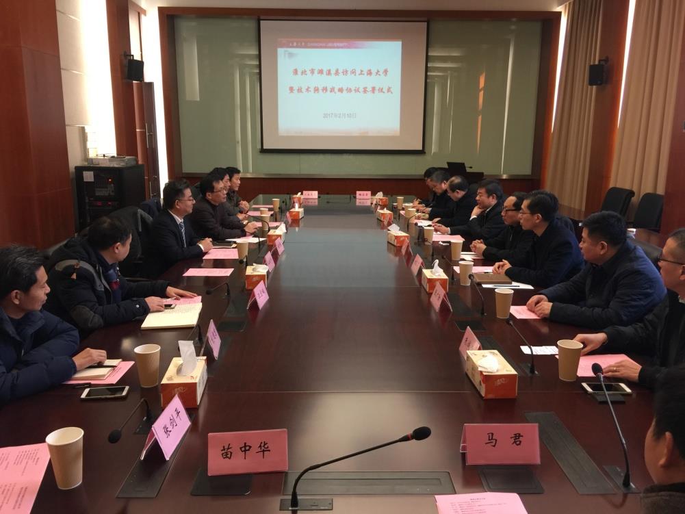2月10日上午,安徽省淮北市委常委、濉溪县县委书记李加玉一行访问beat365英国官方网站并举行技术转移战略协议签署仪式。beat365英国官方网站副校长汪敏、管理学院党委书记李伟、国家大学科技园总经理兼学校技术转移中心主任施利毅等热情接待来宾。汪敏副校长在欢迎致辞中指出,要以学校综合改革和双一流建设为契机,加强校区及产学研合作,切实推进相关成果落地,提升学校服务社会的能力。李加玉书记在讲话中感谢学校在开学第一天就精心组织双方交流活动,提出县委、县政府高度重视与beat365英国官方网站的合作,希望尽快启动双方实质性合作。交流活动及协议签署仪式由施利毅教授主持。 在汪敏副校长和李加玉书记共同见证下,科技园区总经理、技术转移中心主任施利毅教授和安徽省淮北市濉溪县吴杰副县长签署了《濉溪县人民政府—beat365英国官方网站战略合作协议书》。参加签约仪式的濉溪县领导还有:濉溪县人大常委会主任李相军、濉溪县商务局局长刘须芹、濉溪经济开发区管委会副主任化鹏程、安徽家园铝业有限公司董事长张广勋等。beat365经管中心主任山鸣峰、科技处副处长朱晓锦、科技发展研究院副院长刘桂华、招毕办副主任、材料学院汪宏斌等,管理学院马君教授、机自学院苗中华副教授、纳米中心张剑平教授、杭建忠教授及技术转移中心相关教师参加了签约仪式。交流活动后,濉溪县领导及企业代表一行参观考察了beat365英国官方网站纳米中心科技成果应用单位、上海小巨人企业上海华晖新材料科技有限公司,校企合作开发的国际先进铝合金表面陶瓷涂层在海内外重大建设工程中获得应用,已取得良好的经济社会效益。