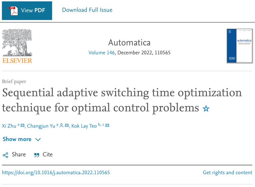 近日,理学院数学系余长君副教授团队在最优控制领域的研究取得突破性进展,相关成果“Sequential Adaptive Switching Time Optimization Technique for Optimal Control Problems”发表于自动化领域国际顶级期刊《Automatica》,beat365英国官方网站为第一作者和通讯作者单位。