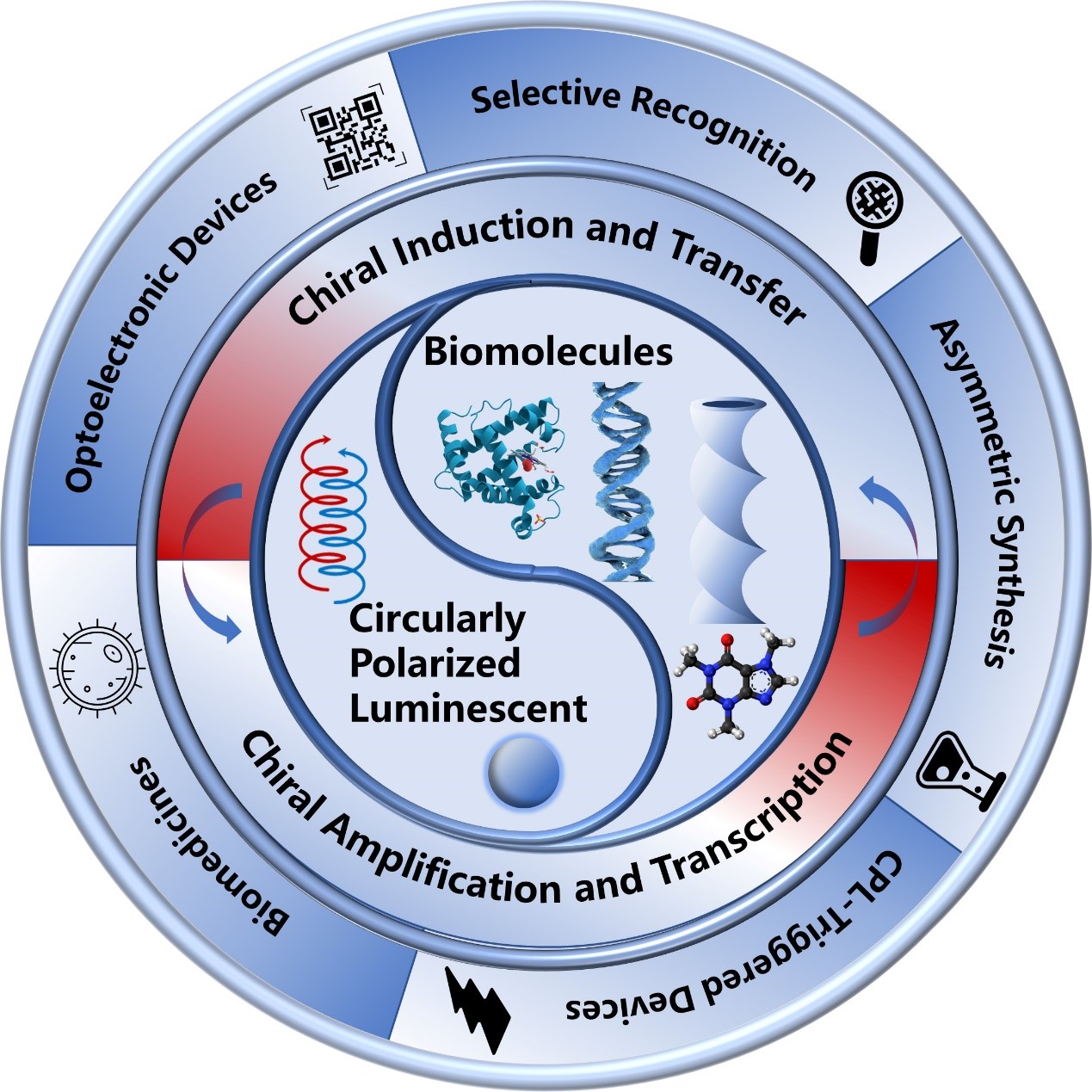 团队在前期研究工作的基础上,系统总结了具有CPL特性的材料本征手性、手性诱导和手性放大的信号策略。部分手性生物分子具有CPL信号,但信号往往较弱,不能直接被有效记录和利用。研究人员可通过配位、共价合成和非共价相互作用等手性诱导方式实现手性转移,以及进一步自组装、共组装和荧光共振能量转移等策略进行手性放大,同时解决构建具有高不对称因子(glum)的CPL材料的关键问题。此外针对不同生物分子,对基于氨基酸/多肽/蛋白质、核苷/核酸以及糖类/脂类模板的CPL功能材料进行分类讨论,并系统汇总了在光电器件、手性生物识别、不对称合成、CPL敏感器件和生物医学领域的潜在应用(图1)。