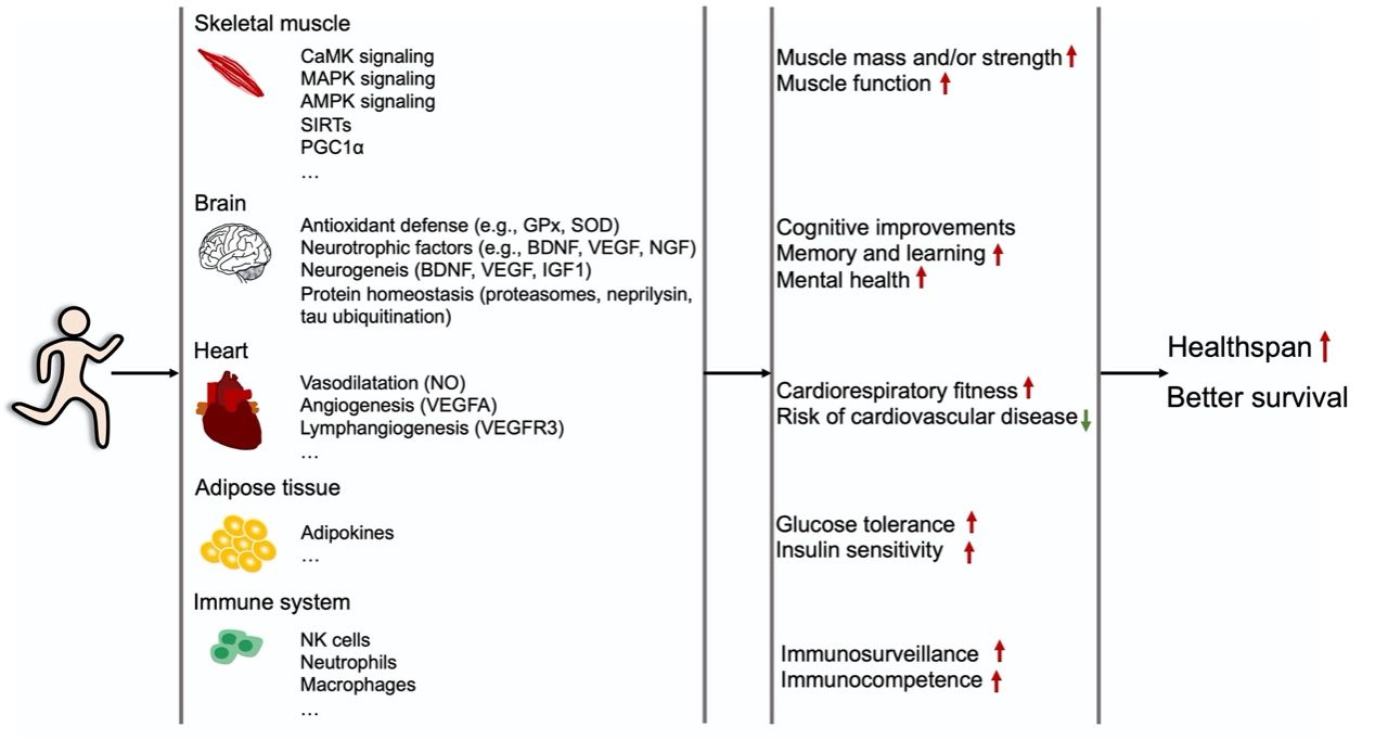 运动锻炼具有系统性的效应。长期规律运动对健康有多种益处。运动锻炼引起机体的多组织器官系统(包括骨骼肌、大脑、心脏、脂肪组织、免疫系统等)的适应性反应,这些适应性反应共同促进机体的健康(图2)。