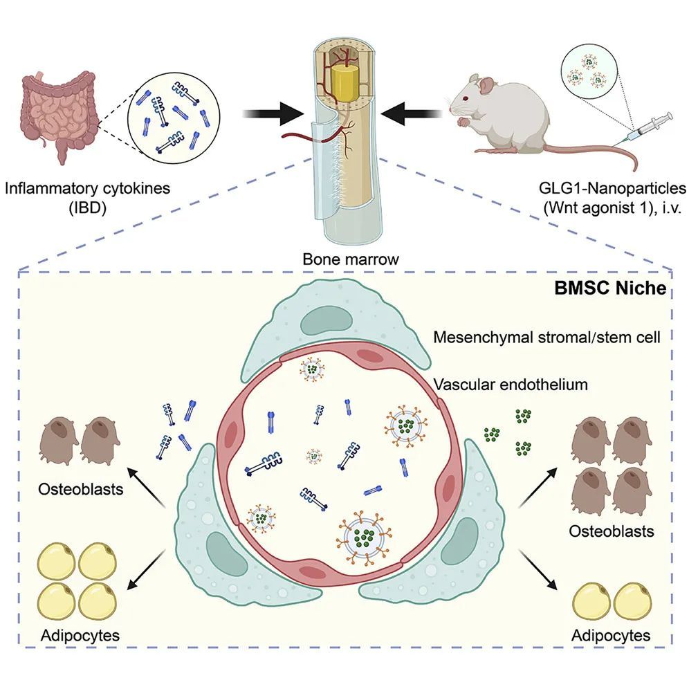 通过该研究,我们发现了在IBD模型中,小鼠骨量下降。IBD 的骨髓炎症微环境会使BMSC 增殖能力下降,BMSC趋向于向脂肪细胞方向分化,这为研究IBD骨松的发病机理奠定了基础。此外,我们的研究结果表明以GLG1 外泌体为基础搭载Wnt agonist 1 构建的NP 具有良好的骨靶向性和BMSC 靶向性。GLG1-NP能够长时间在骨组织内驻留,为药物的作用提供了较长的时间窗,以及为临床上IBD骨松的治疗提供一个潜在的治疗方案。