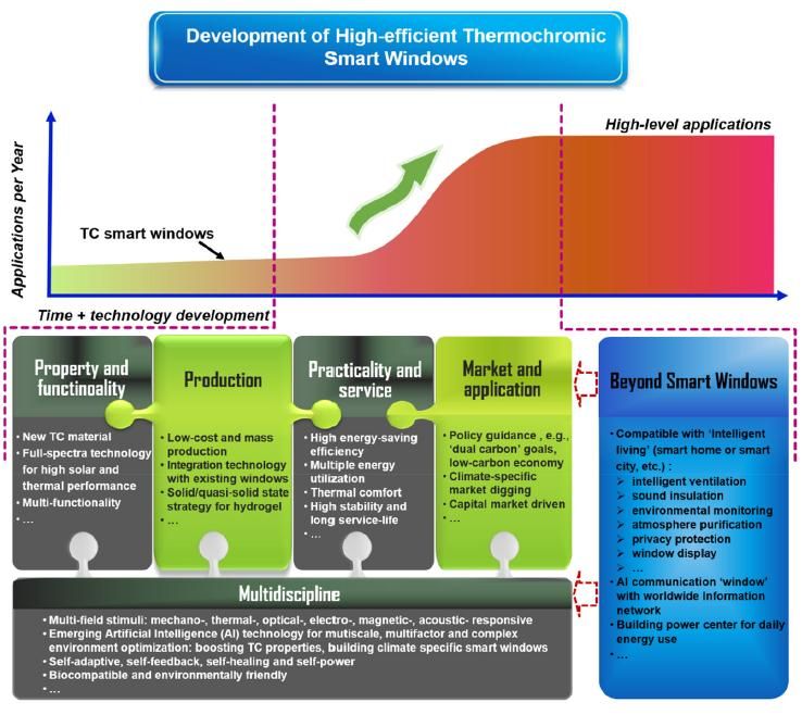 这篇综述从热致变色材料的结构、微/中尺度的性能调控、与其它新兴能源技术的集成等方面,评述了热致变色材料和系统的最新研究进展,展示了热致变色材料在建筑节能中的实际应用,介绍了热致变色节能窗的挑战和机遇。