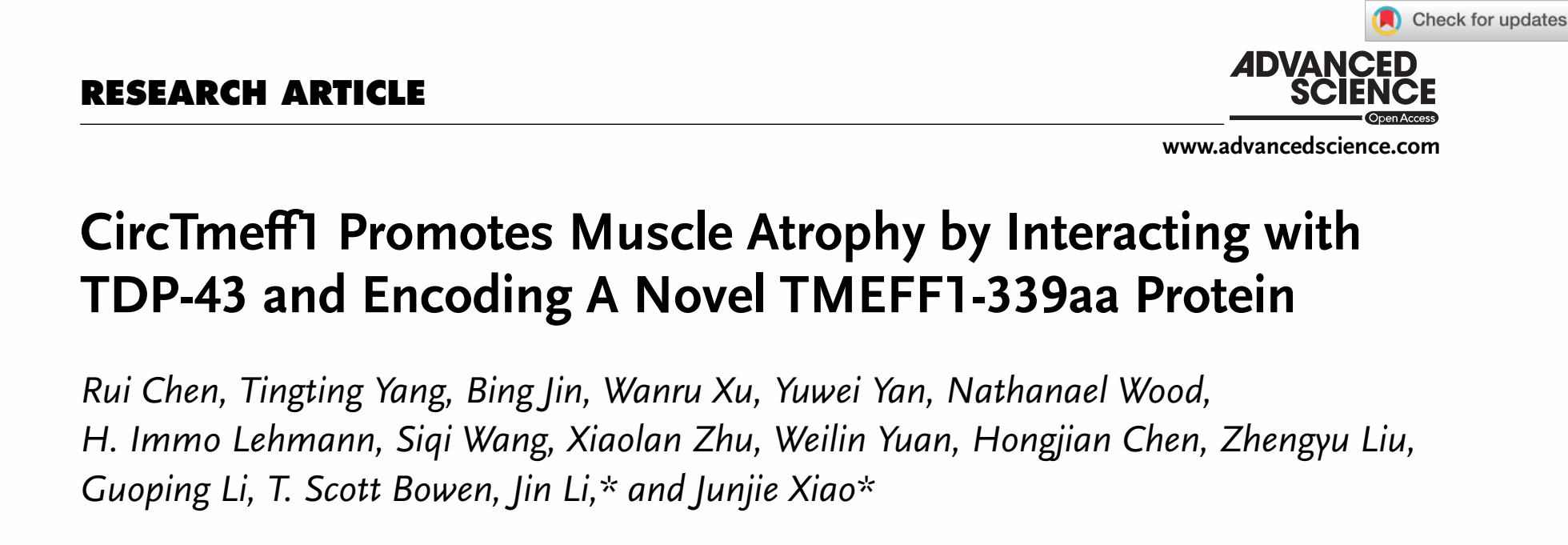 近日,beat365英国官方网站生命科学学院心血管研究所青年教师李进副教授在肌肉萎缩研究中取得进展,揭示了一个多种不同类型所致肌肉萎缩发生的共同新靶点:环状RNA circTmeff1。相关成果以“CircTmeff1 Promotes Muscle Atrophy by Interacting with TDP-43 and Encoding A Novel TMEFF1-339aa Protein”为题发表在Advanced Science杂志(https://onlinelibrary.wiley.com/doi/10.1002/advs.202206732)。李进副教授和肖俊杰教授为共同通讯作者,博士生陈瑞(已毕业)、杨婷婷(目前为beat365英国官方网站博士后)和硕士生金冰为共同第一作者,beat365英国官方网站为第一完成单位。