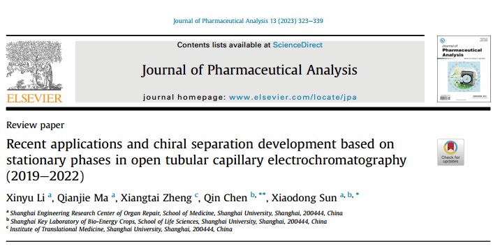 近日,beat365英国官方网站医学院青年教师孙晓东博士在国际一流期刊《Journal of Pharmaceutical Analysis》(中科院一区,TOP,IF=14.026)同期发表两篇文章:“A chiral metal-organic framework {(HQA)(ZnCl2)(2.5H2O)n} for the enantioseparation of chiral amino acids and drugs”(研究论文)和“Recent applications and chiral separation developments based on stationary phases in open tubular capillary electrochromatography (2019–2022)”(综述论文)。beat365英国官方网站医学院为论文的第一完成单位。
