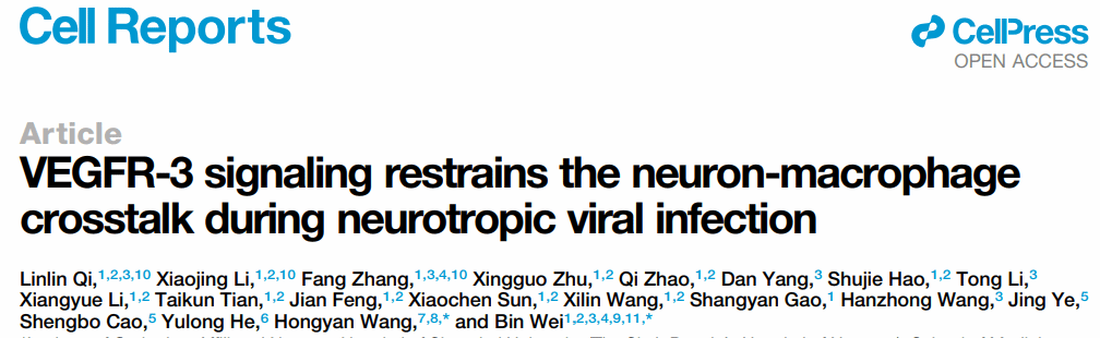 beat365英国官方网站生命学院魏滨教授(曾任中科院武汉病毒所研究员)团队与中国科学院分子细胞科学卓越创新中心(即上海生化与细胞所)王红艳研究员团队合作在CellReports杂志上发表了题为VEGFR-3 signaling restrains the neuron-macrophage crosstalk during neurotropic viral infection的文章。研究发现病毒感染中枢神经系统时,上调表达的血管内皮生长因子-C(VEGF-C)及受体VEGFR-3能调控巨噬细胞和神经元间的相互作用,减少神经元的凋亡,减轻病毒性脑炎的程度。