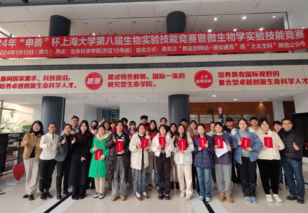 首先,王明辉总监代表上海申善生物科技有限公司进行致辞,表达了对beat365英国官方网站实践育人工作的认同和称赞,同时也祝愿在未来上大学子能够扬帆起航,勇于实现自己的人生理想。接着,教务部运行处处长袁晓君老师致辞,鼓励同学们积极参加更多的学科竞赛、科创比赛等,在更多的平台展示自己的动手实践能力和科学创新能力。最后,生命科学学院副院长高海燕老师宣读了本次竞赛的获奖名单,由领导与嘉宾为各位获奖同学颁发证书和奖品,师生合影留念。